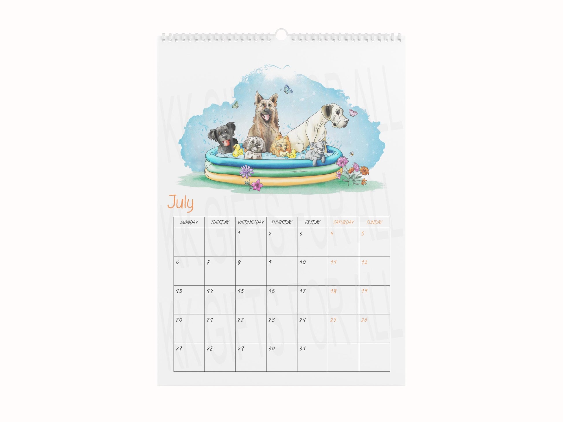 Each month has a month to view calender grid on a full A4 sheet with a different dog imahe for each month. Room to write down important birthdays or events. This calendar will look perfect in any home or office.