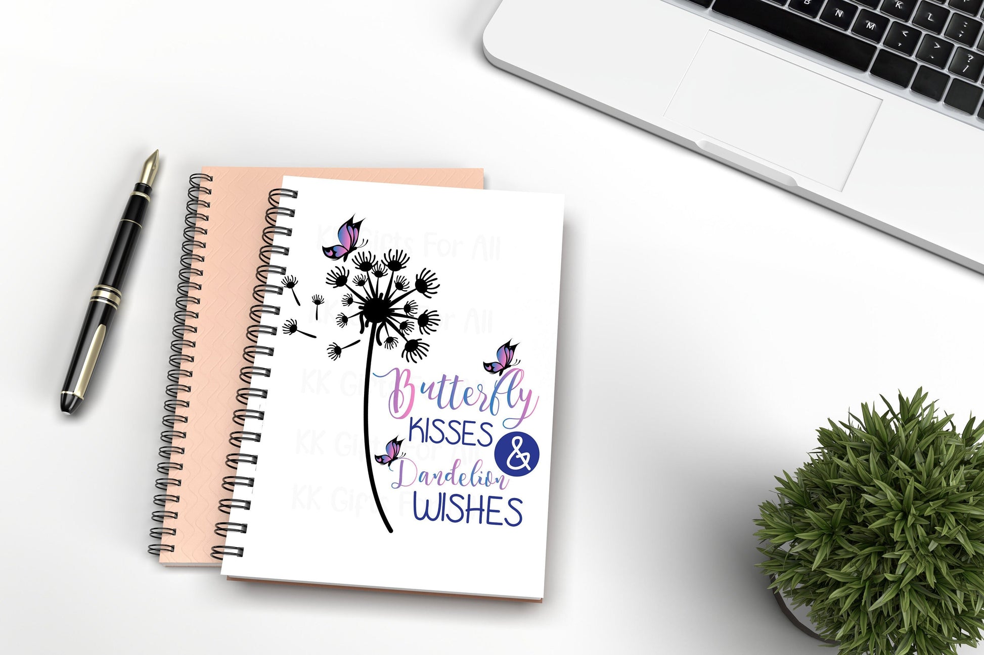 Butterfly kisses & dandelion wishes notebook. Dandelion with pink and purple butterfly and text. Black dandelion.