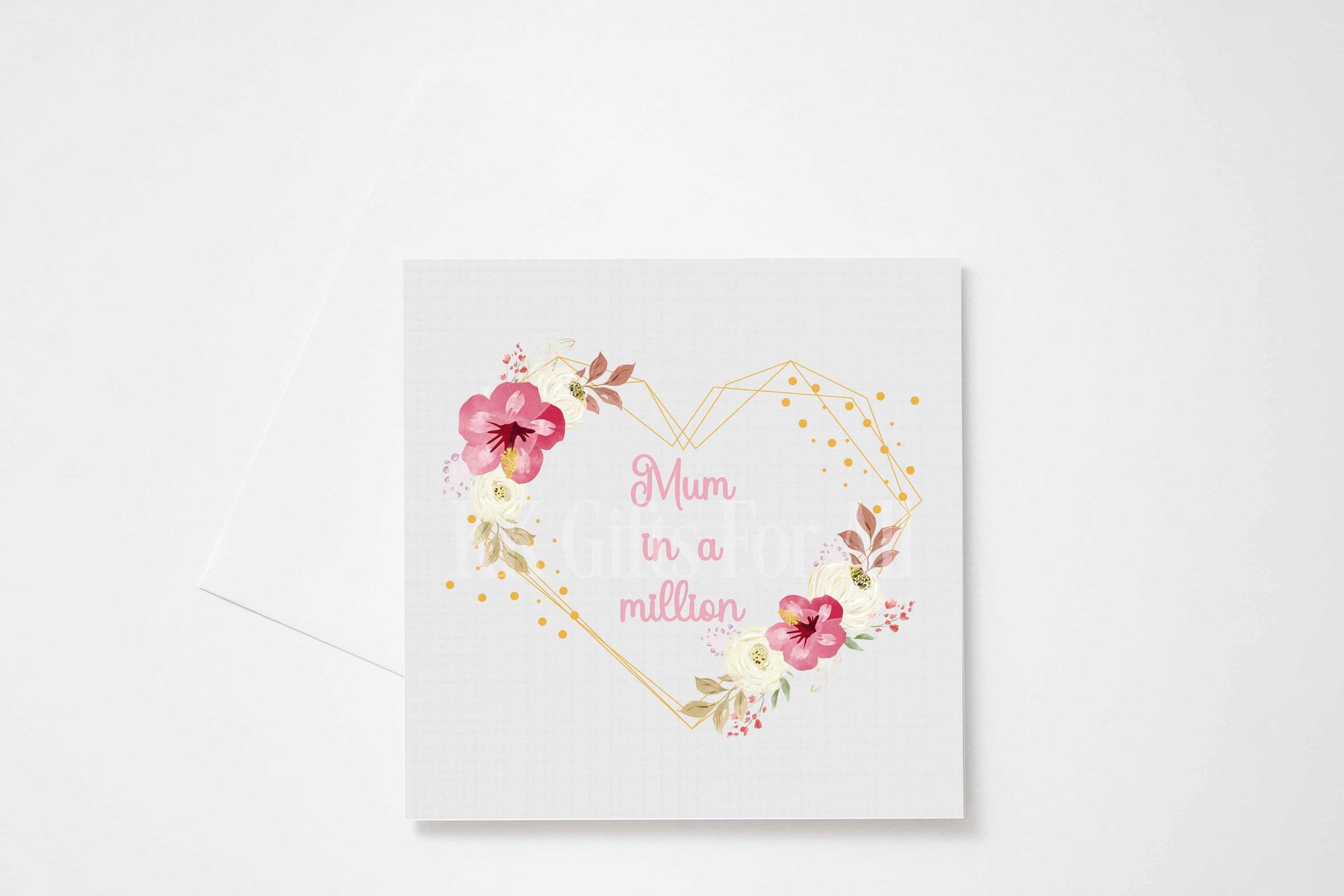 A perfect card for mum for mother's day or mum's birthday. Mum in a million in pink text inside a heart shape gold wreath frame with flowers. Cardbfor the best to mum.