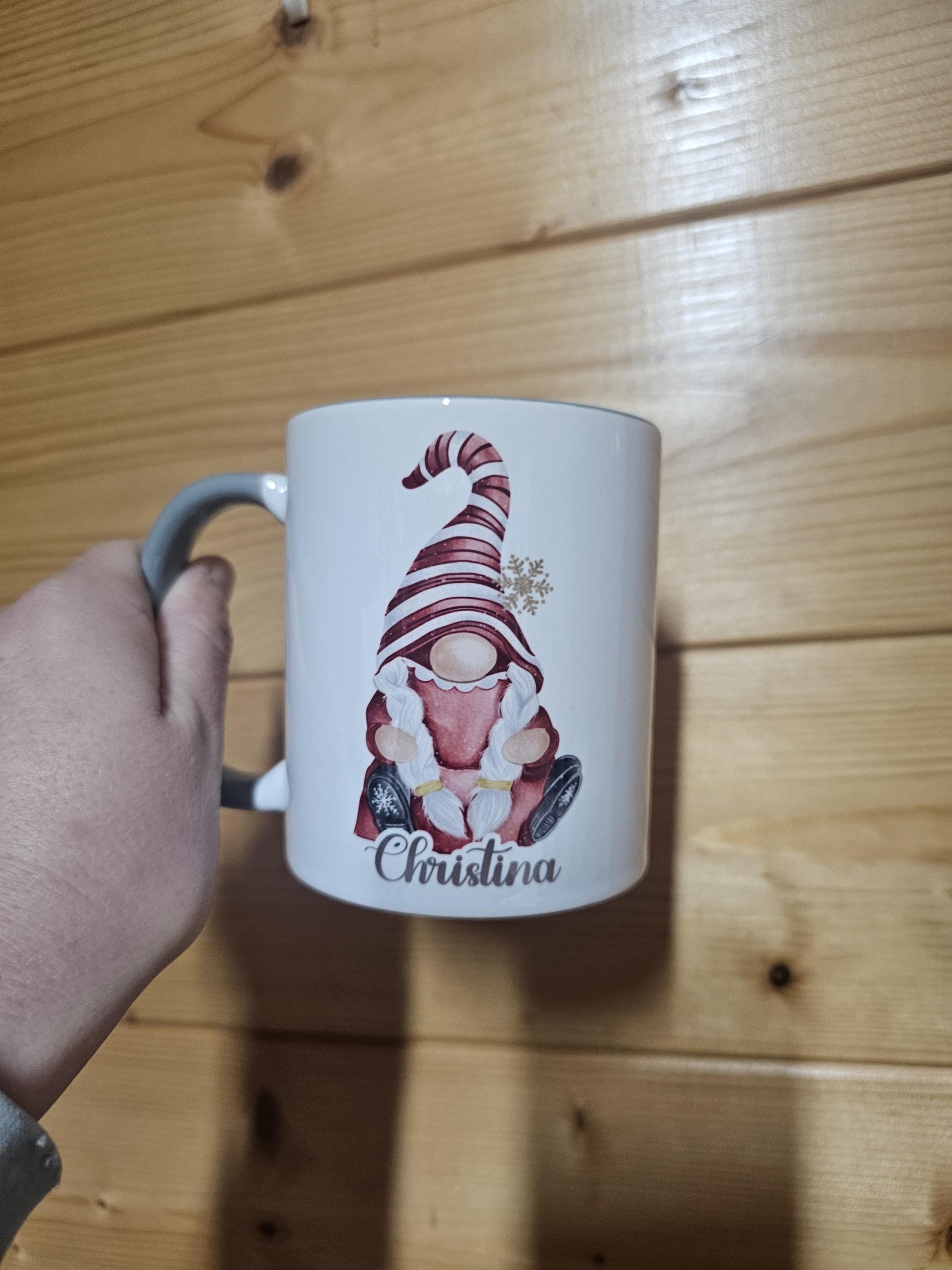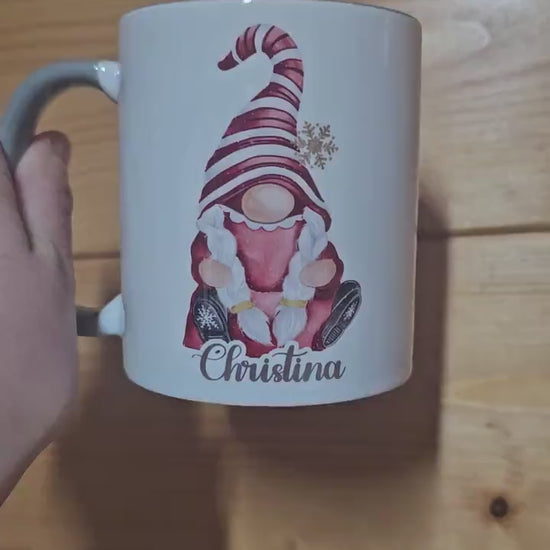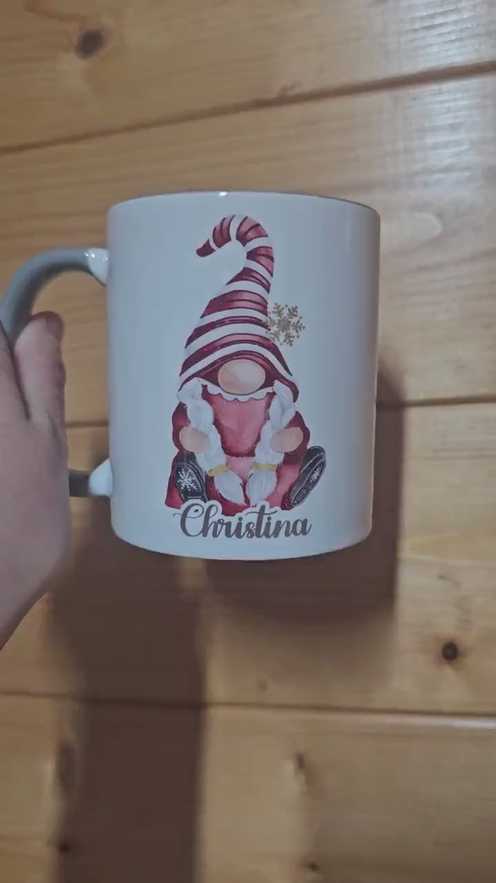 Gift for mum, friends, colleague, co worker secret santa. Family Christmas mugs. Christmas gonk gnome mug. Christmas eve box mug for teens. Gift for someone who loves gonks. Personalised with name. Grey handle Gonk mug - matching coaster available. Gift for wife or girlfriend.