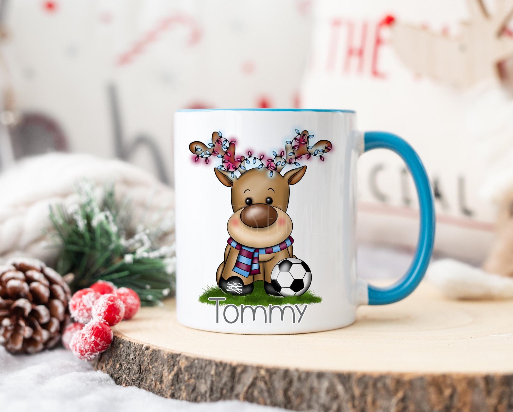 Christmas Football Reindeer Mug, Personalised Grey Christmas Mug, Football Coach Gift, Football Lover Xmas Mug, Claret & Blue Footie Team
