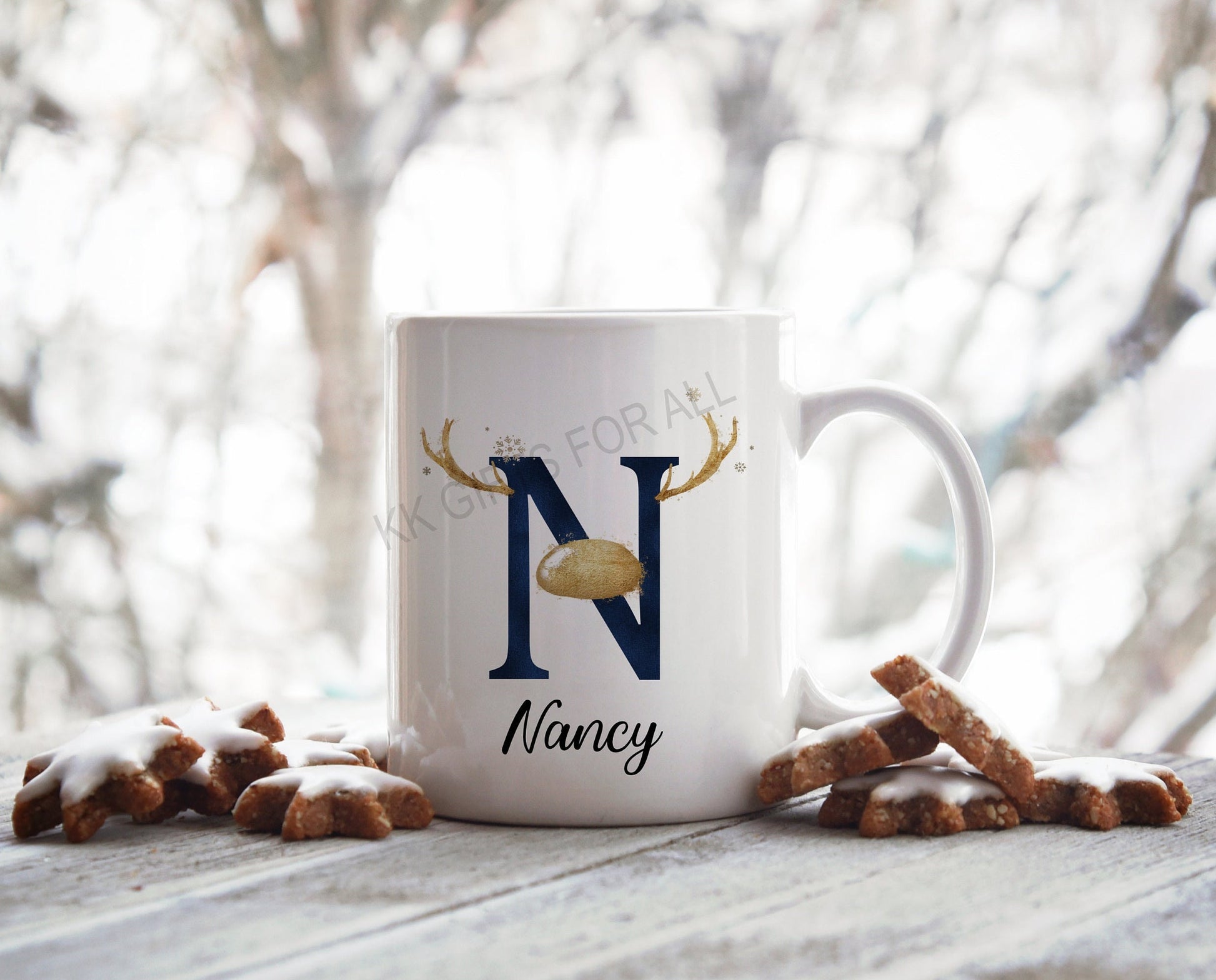 Christmas Mug, Personalised Name And Initial, Antler Initial Design Mug, Hot Chocolate Mug, Xmas Eve Box Mug, Christmas Movie Mug, Cute Xmas