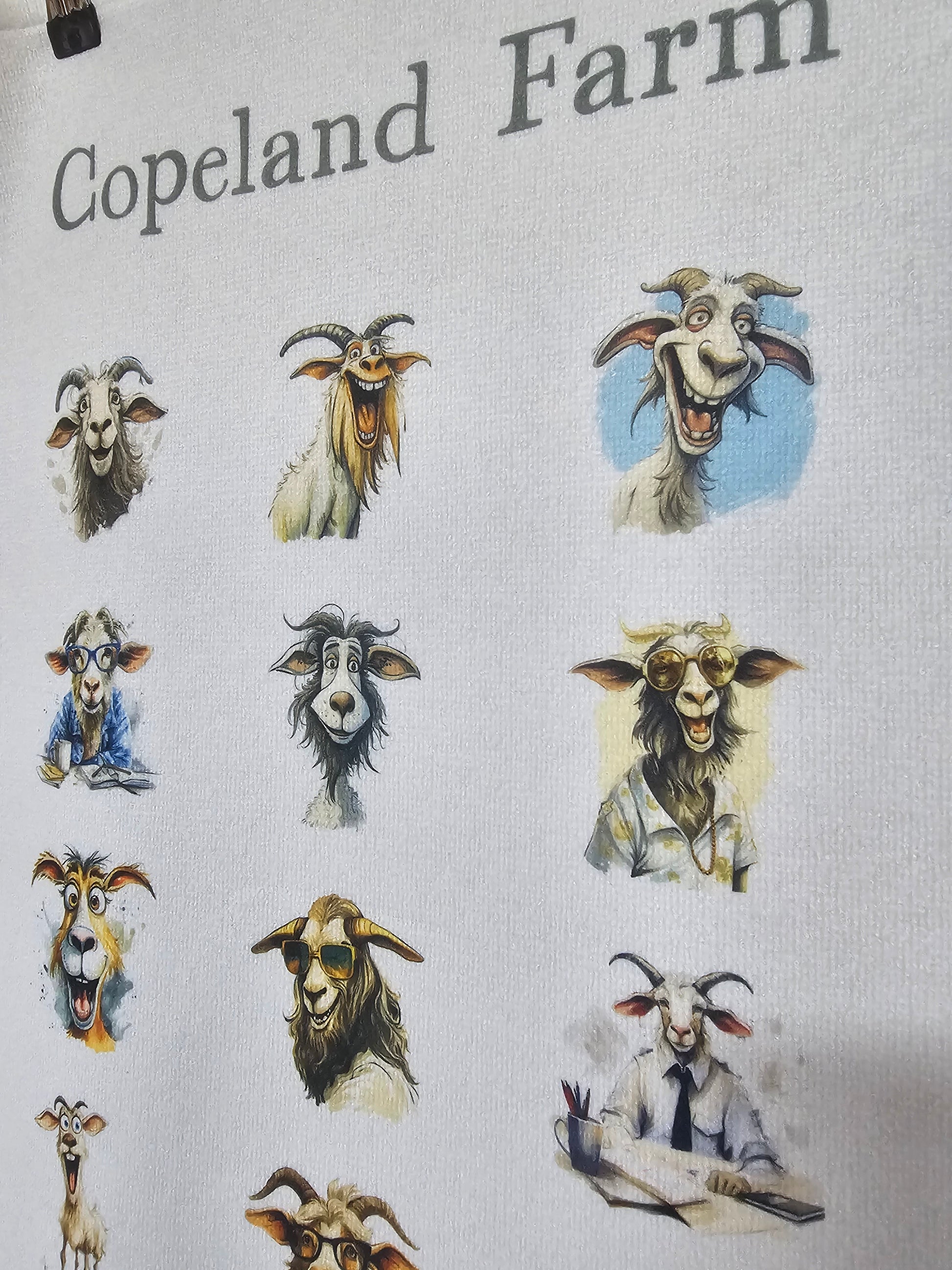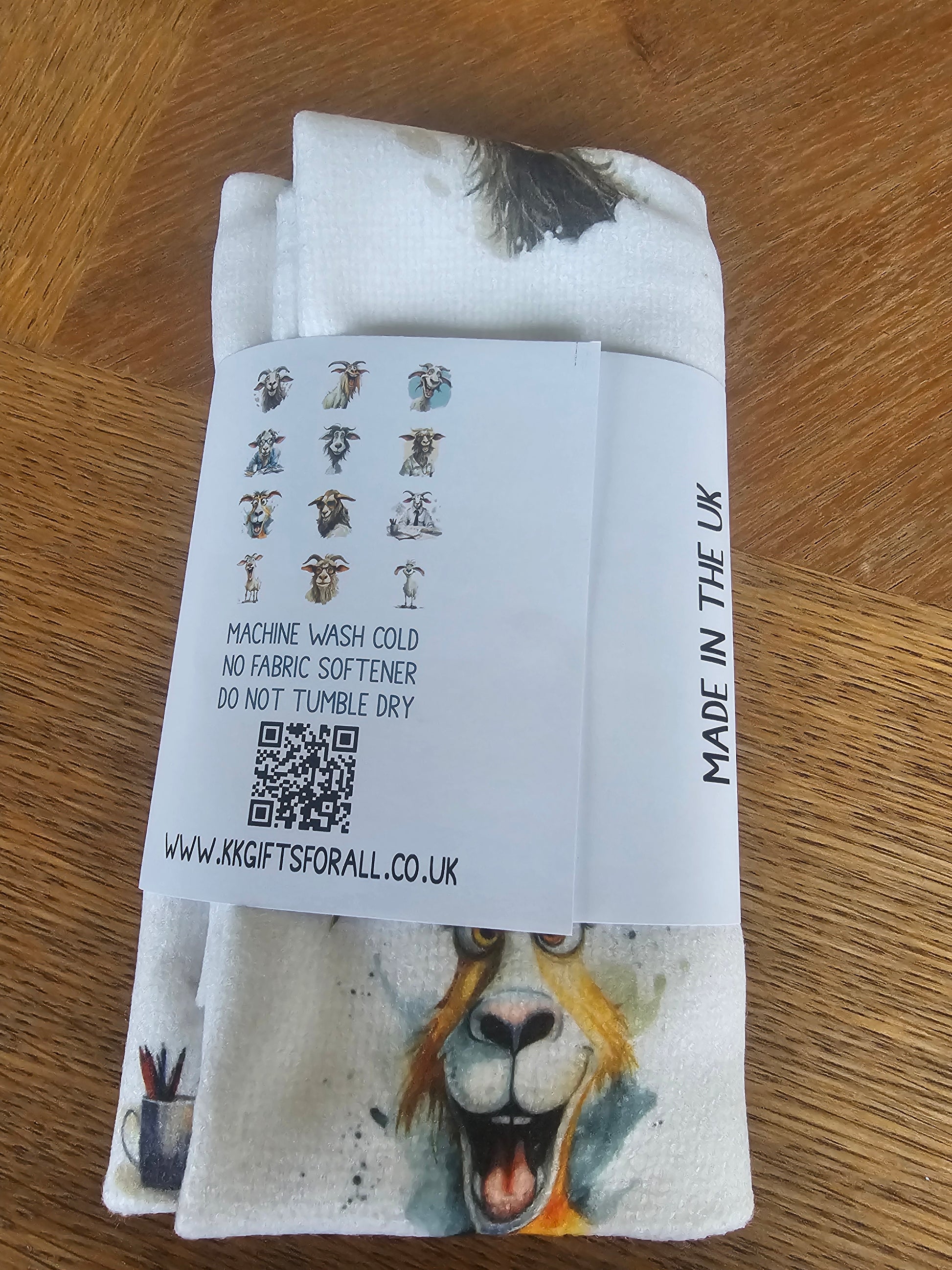 Quirky goat artwork printed on a soft cotton polyester tea towel