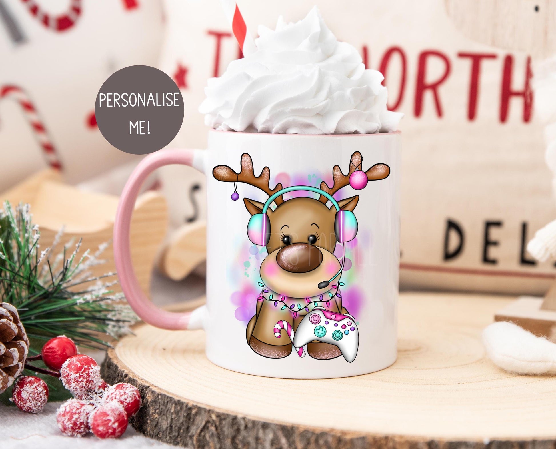 Children's Christmas Mug, Personalised Pink Reindeer Mug, Gamer Gifts