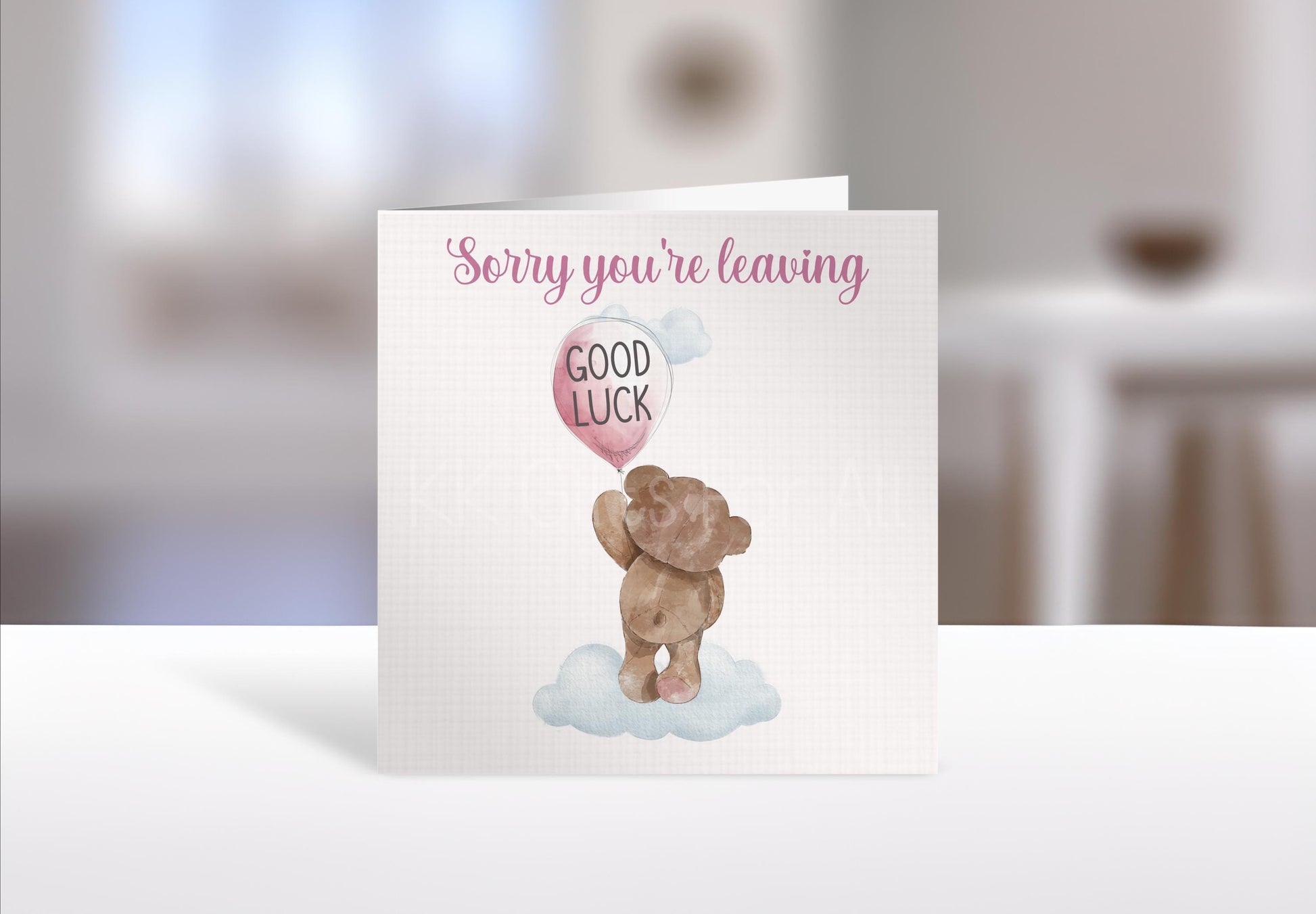 Cute bear leaving card. Available in pink or blue. Goodbye card. Good luck in new job card. Colleague leaving card.