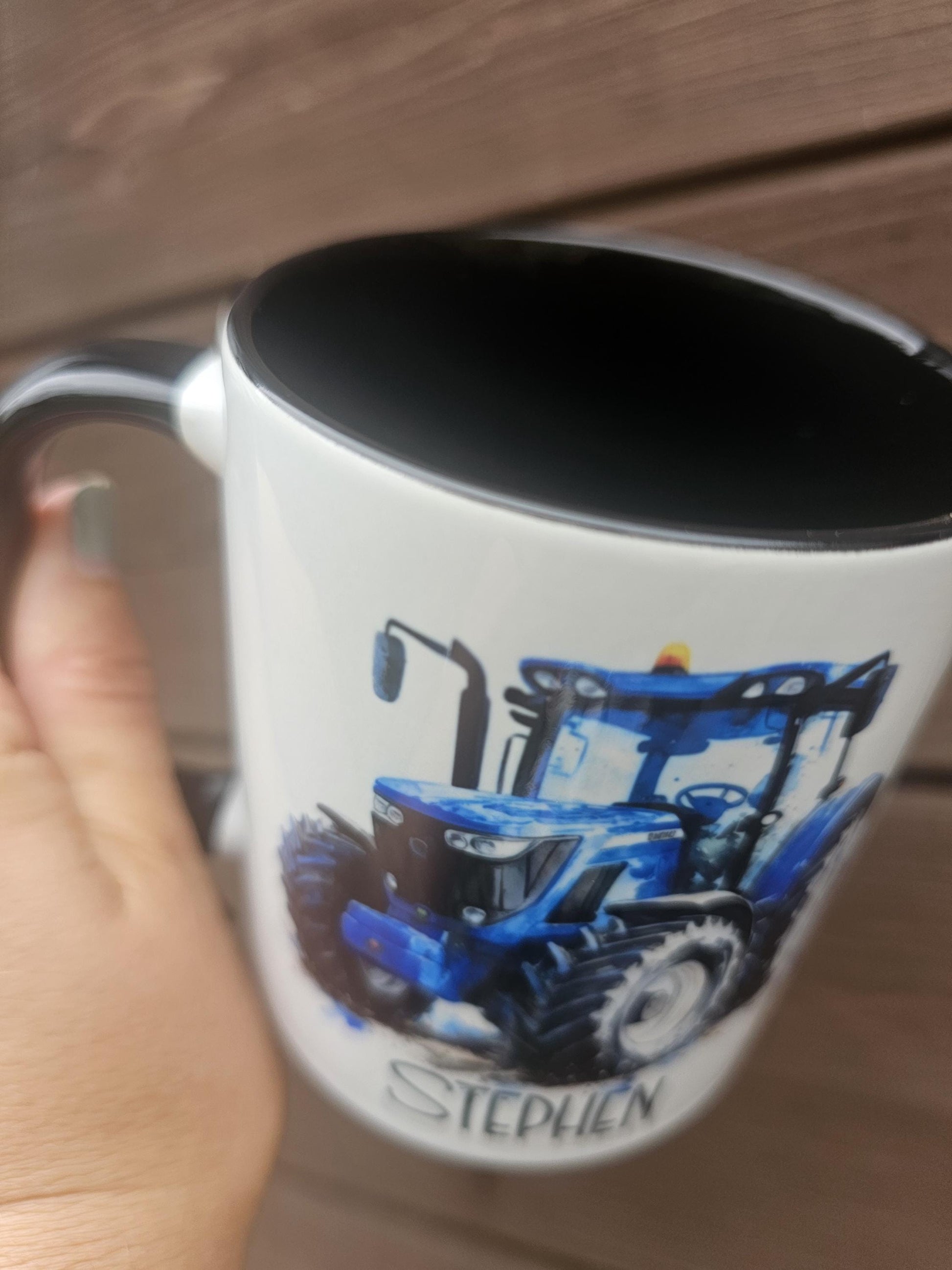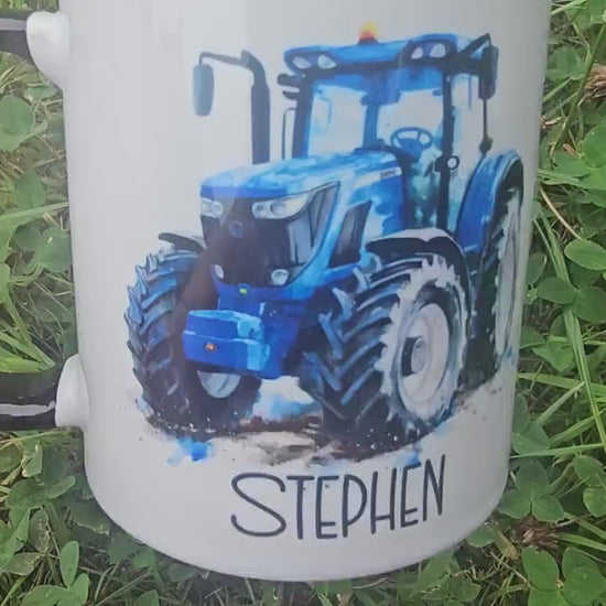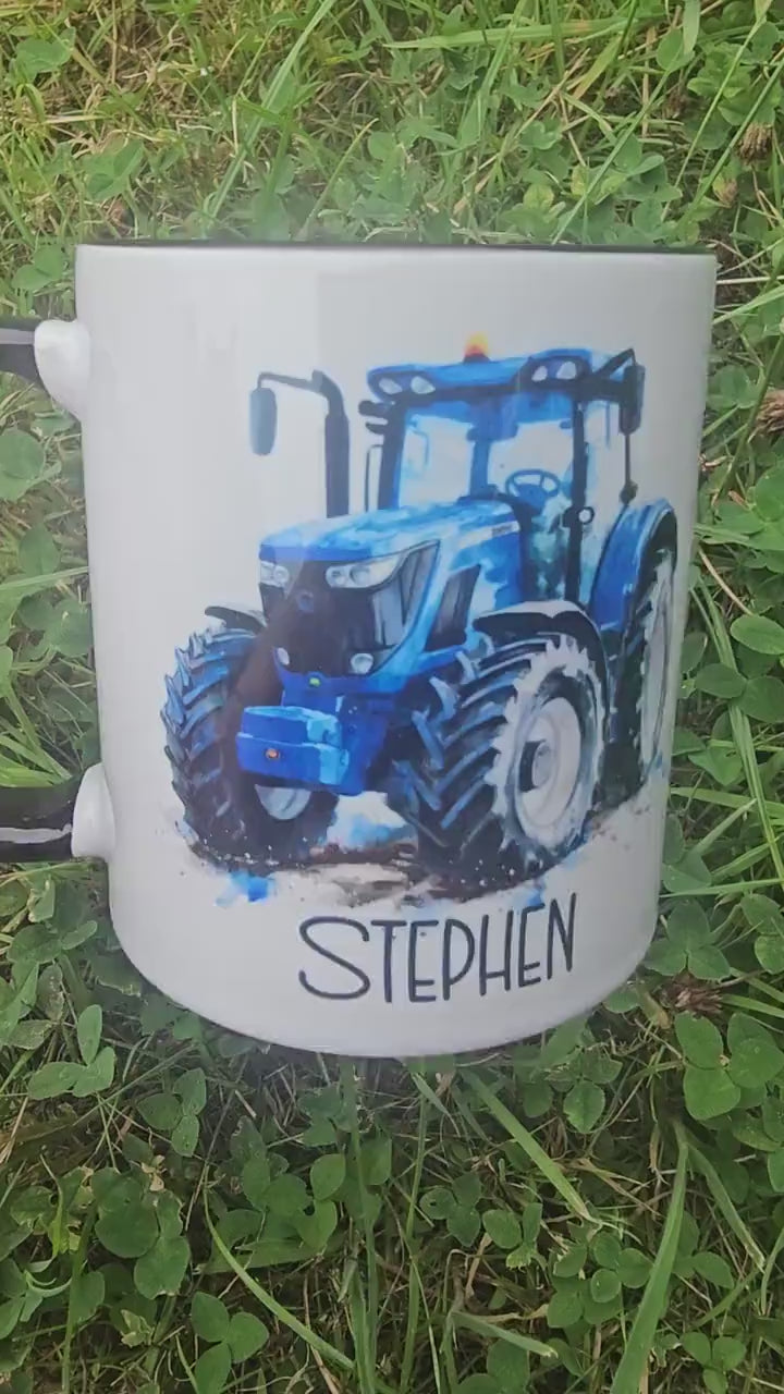 Blue modern tractor on a white ceramic mug with black inner and handle. Personalised with a name under design in choice of black or blue.