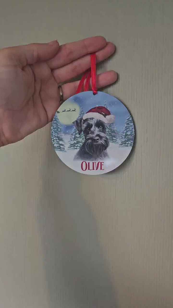 Round christmas tree ornament. Keepsake christmas decoration. Gift for someone to hang on their christmas tree each year. Christmas tree decoration. Christmas 2024 keepsake ornament. Round metal bauble is perfect for hanging on a christmas tree or around the house to give it that festive feel and would also make a lovely christmas gift and a great keepsake. Black schnauzer owner christmas decoration. Schnauzer dog at christmas time.