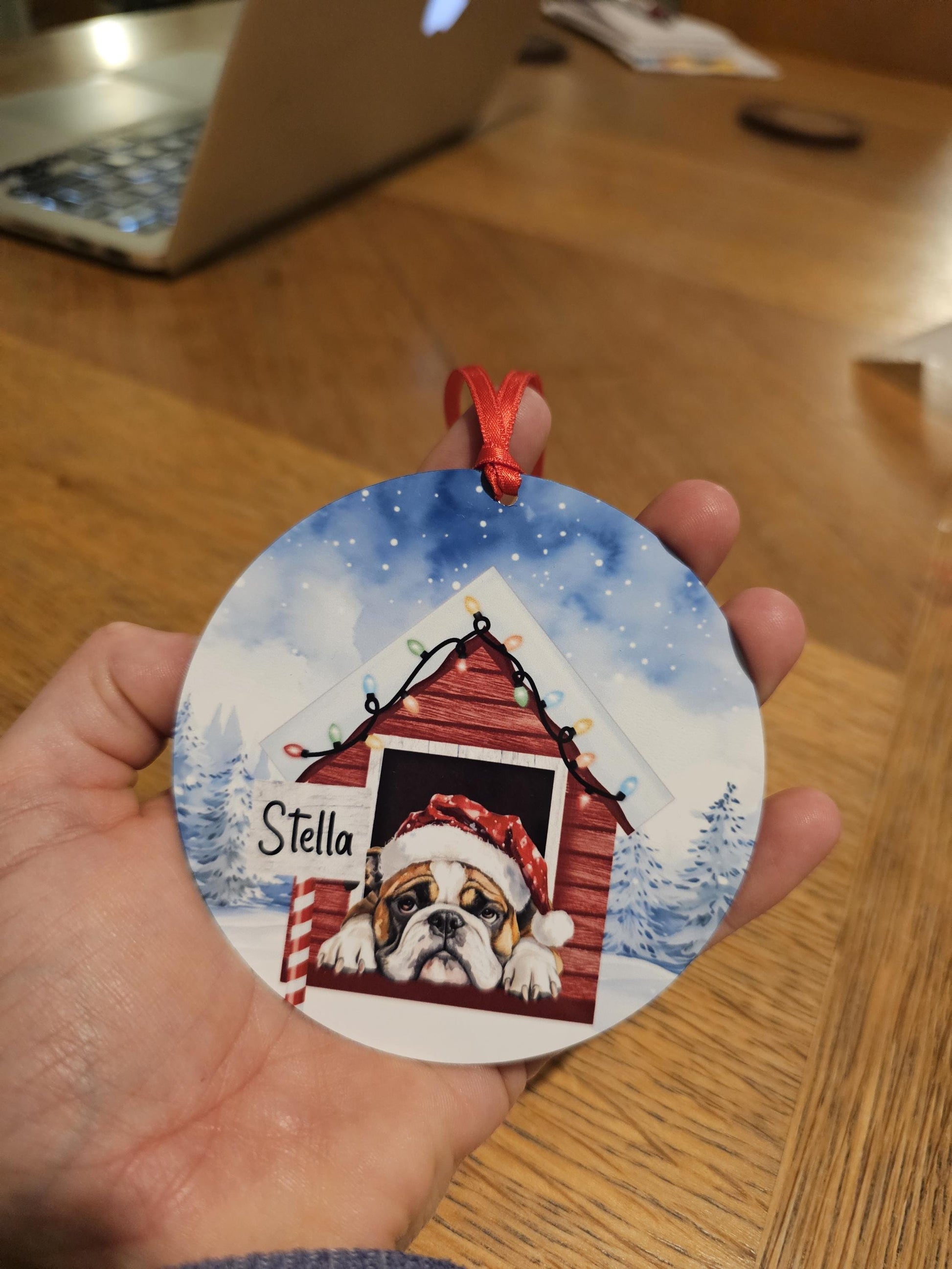 Round christmas tree ornament. Keepsake christmas decoration. Gift for someone to hang on their christmas tree each year. Christmas tree decoration. Christmas 2024 keepsake ornament. Round metal bauble is perfect for hanging on a christmas tree or around the house to give it that festive feel and would also make a lovely christmas gift and a great keepsake. Bulldog owner christmas decoration. Bulldog dog at christmas time.