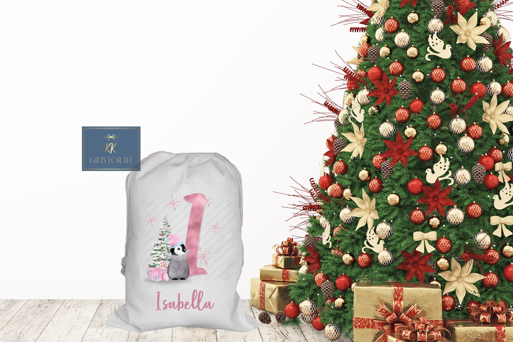 Personalised Christmas Santa Sack Father Christmas Bag, Blue Or Pink Christmas Penguin, Girl Or Boy Large Luxury Sack
