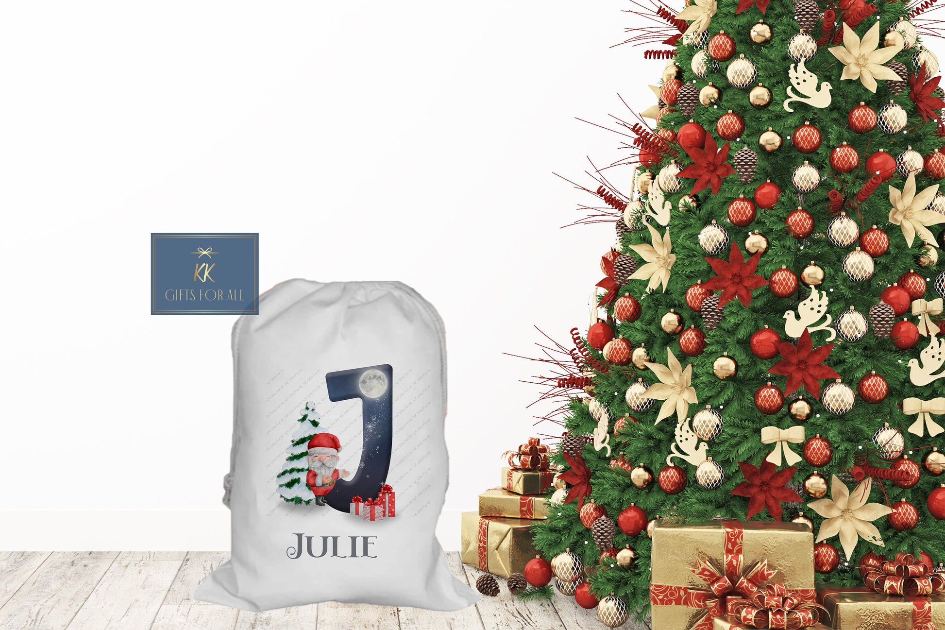 A large luxurious soft feel sack featuring an initial and name. Blue nightfall sky as the colour of the initial with a santa claus in front a christmas tree with snow on the tree and gifts other side. 3 white and red presents on the other side. Personalised with name in a choice of colour: red, navy blue or grey.