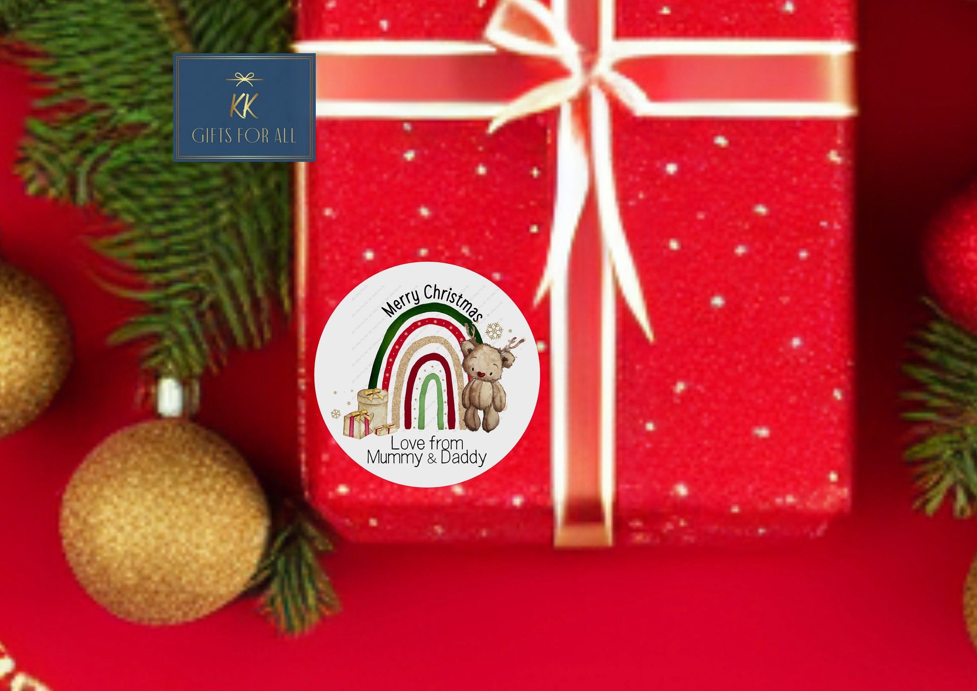 1 A4 sheet of 24 of the same stickers - A cute brown bear with reindeer antlers stood next to a christmas coloured rainbow with gifts. Green red and gold rainbow. Brown presents one side of the rainbow with red and gold ribbon. Cute bear standing and delicate gold snowflakes scattered about in the background. Sticker reads Merry Christmas at the top curved around the rainbow. And personalised at the bottom. All personalised to requirements with 'from mum', 'love santa', "love nanna' or a name. Personalisation is in black with what you wish printed. Please note personalisation is at the bottom of the sticker with what you request. Personalisation will be the same on the sheet of stickers. please enter personalisation exactly as you wish for it to be printed. All 24 stickers will be the same.
