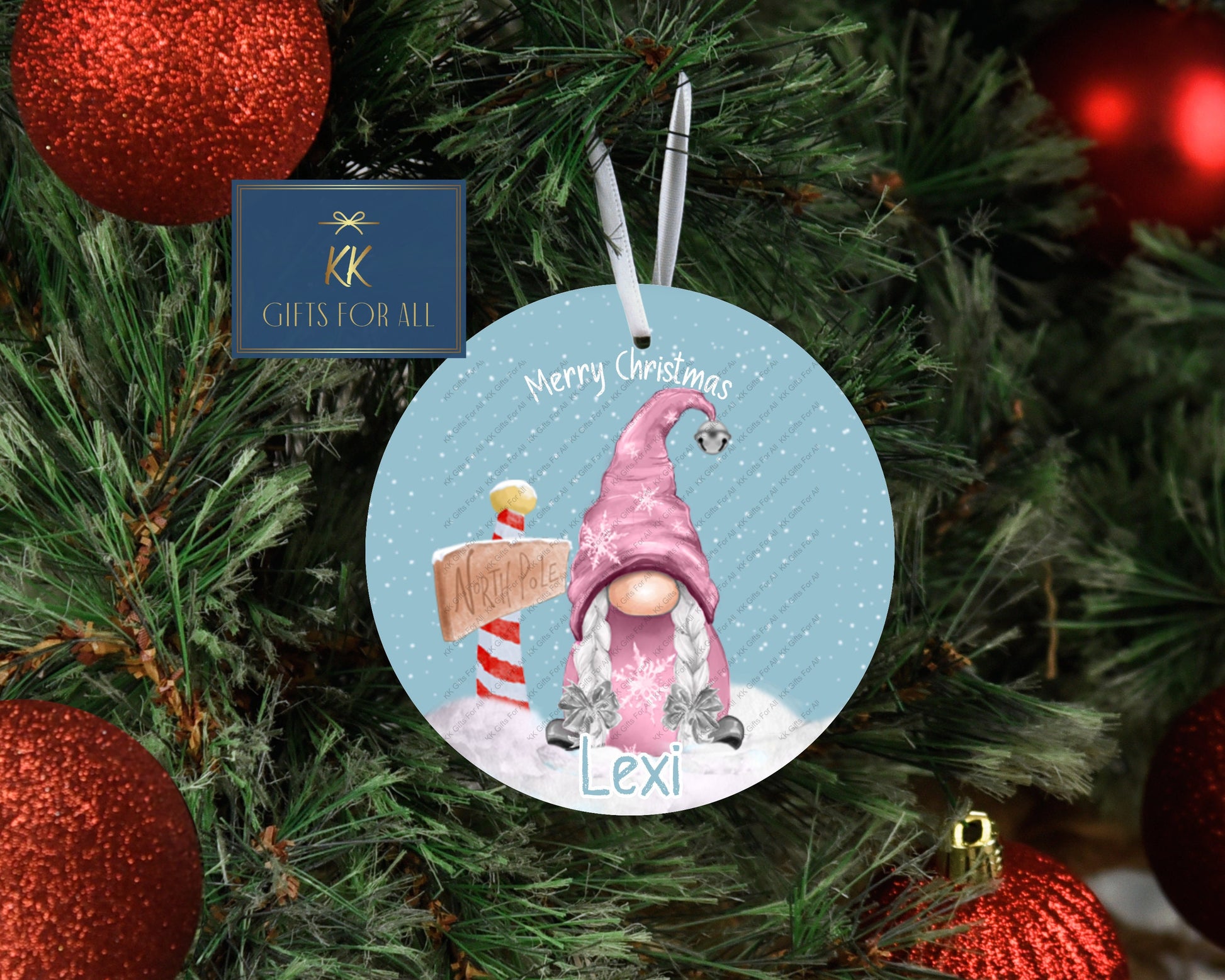 Personalised Christmas Tree Decoration, Christmas Metal Hanging Ornament, Pink Girl Female Gonk Gnome Decoration