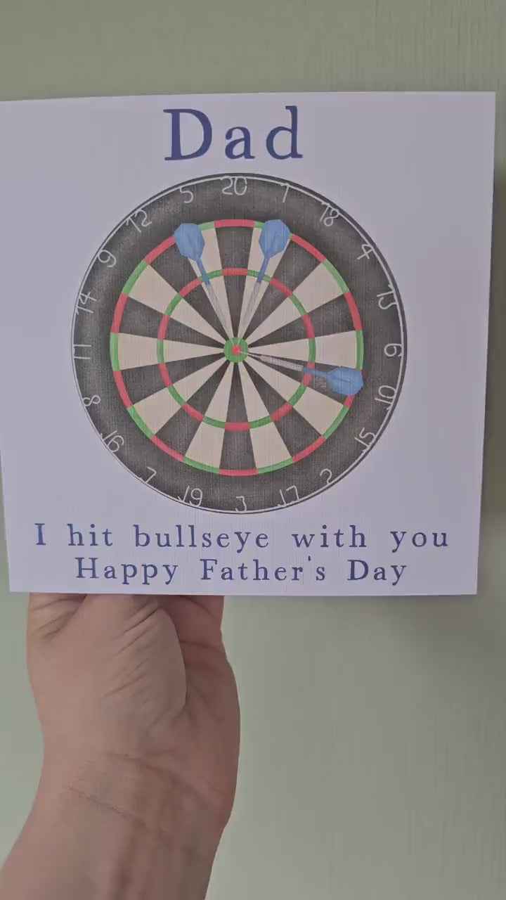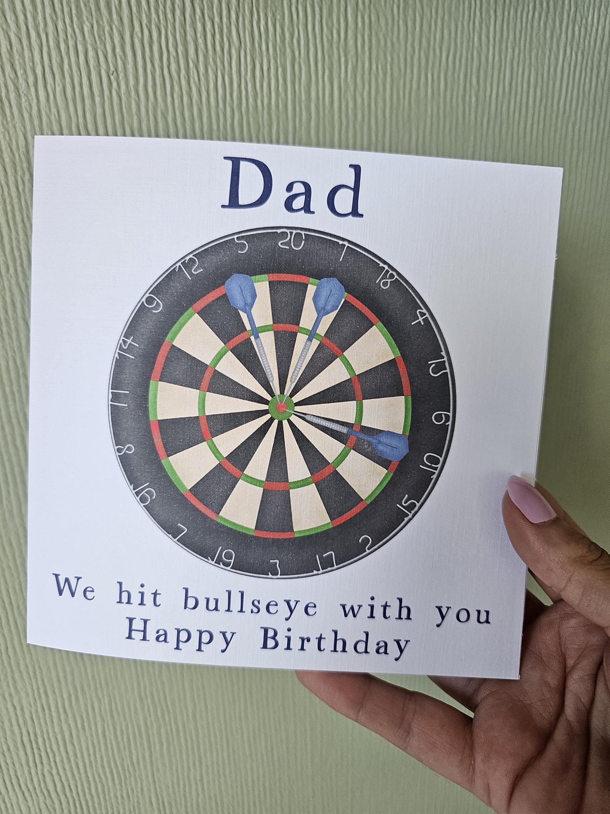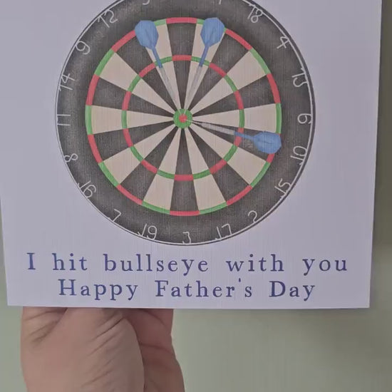 Personalised at top of card. I or We hit bullseye with you, Happy Father's Day at bottom. Text in blue. Dart board in centre with 3 blue darts in the bullseye. Perfect card for dad daddy grandad grampa bamps or bampa who loves darts.