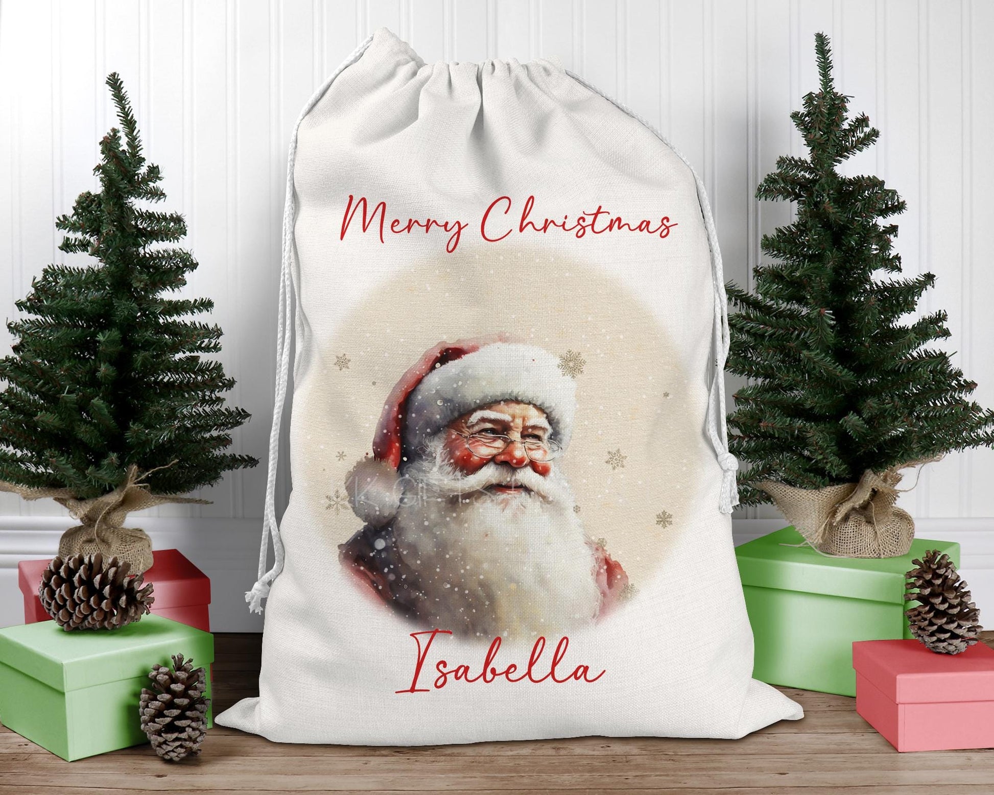 This beautiful Christmas large sack features a classic, jolly Santa Claus illustration and is customized with the name of your choice in red font – creating a keepsake that your family will treasure for years to come.