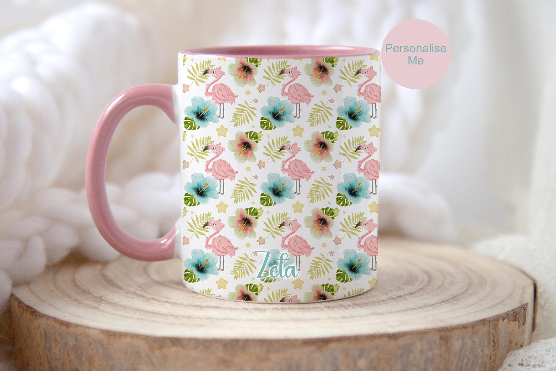 A lovely summer vibe flamingo pattern on a white mug with pink inner and handle. Lovely gift for any flamingo lover birthday. Lovely mug for women. Colourful tea or coffee cup. Can be personalised with name at bottom of mug as shown in photos.