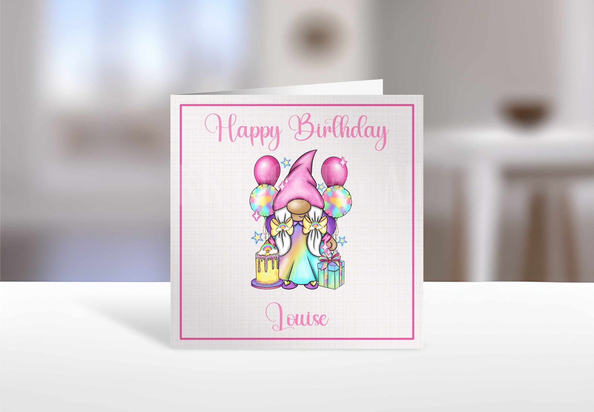 Lovely personalised card for anyone who loves gonks. Colourful Party gnome card. Birthday card for gonk lover. Personalised card for friend birthday. Birthday card for granddaughter, daughter or mum.