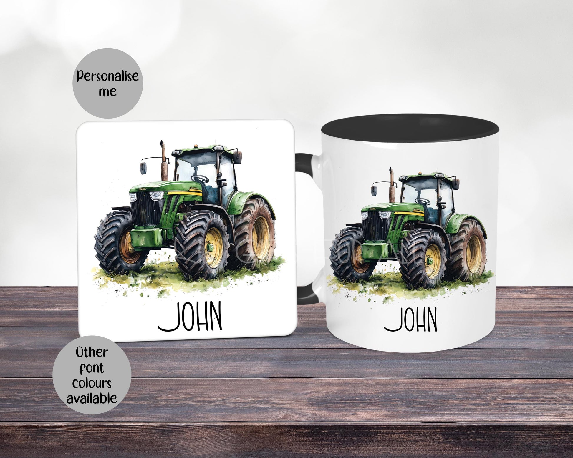 Personalised Green Tractor Mug & Coaster Set, Farmer Gift For Birthday