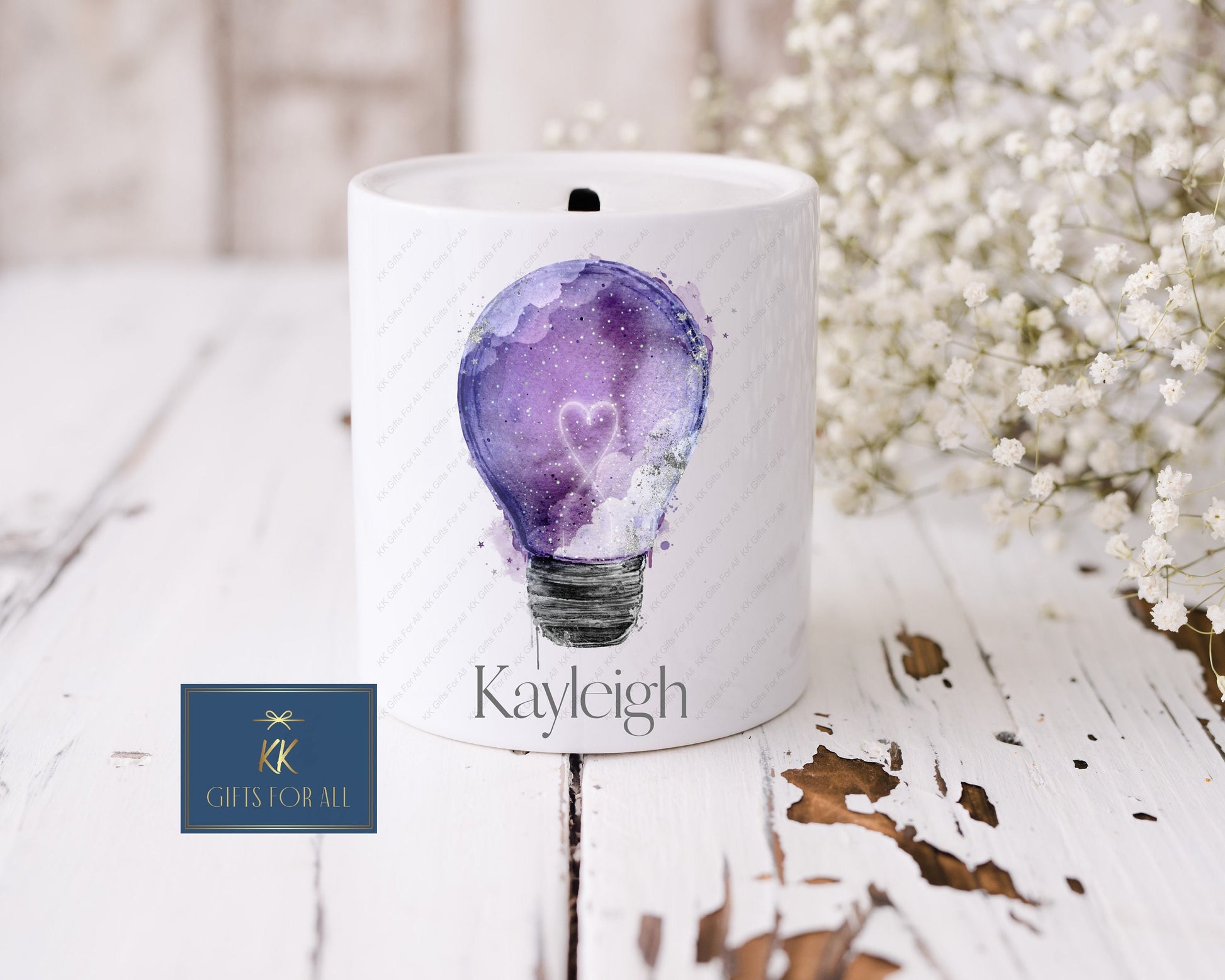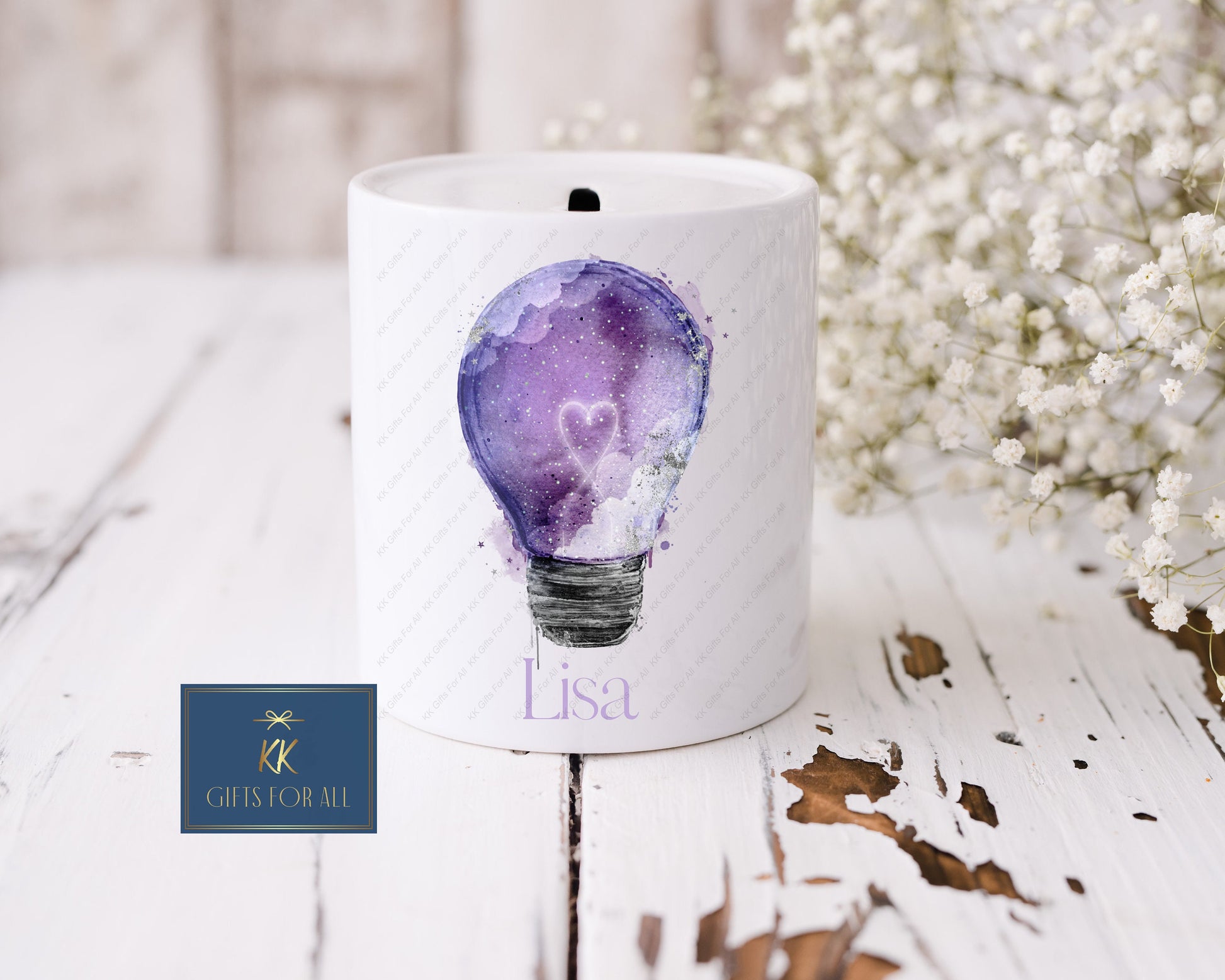 Personalised Money Box, Purple Galaxy Lightbulb Gift, White Ceramic Savings Pot, Money Pot, Piggy Bank, Kids Saving Box