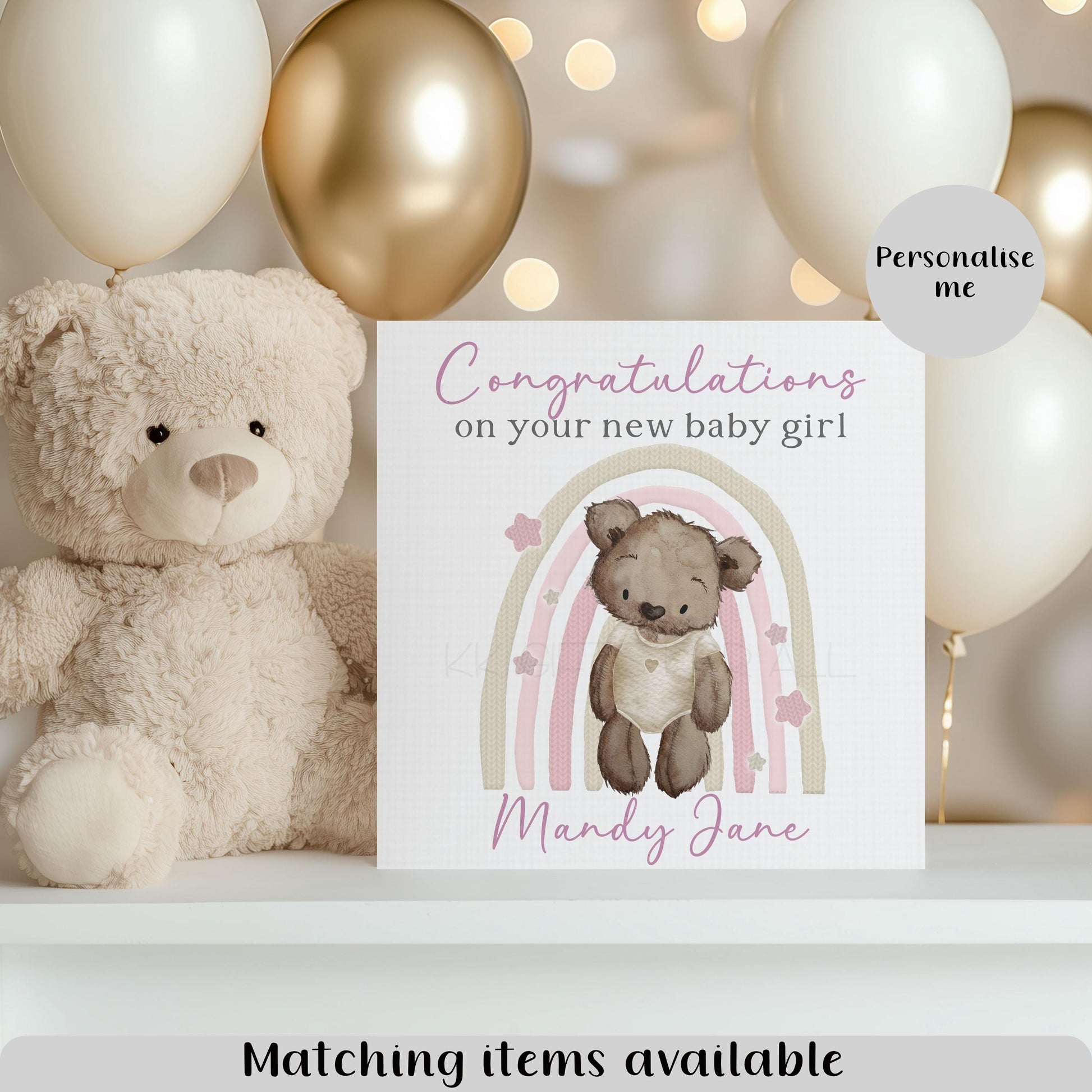 Personalised New Baby Girl Card, Watercolor Teddy Bear Congratulations Card