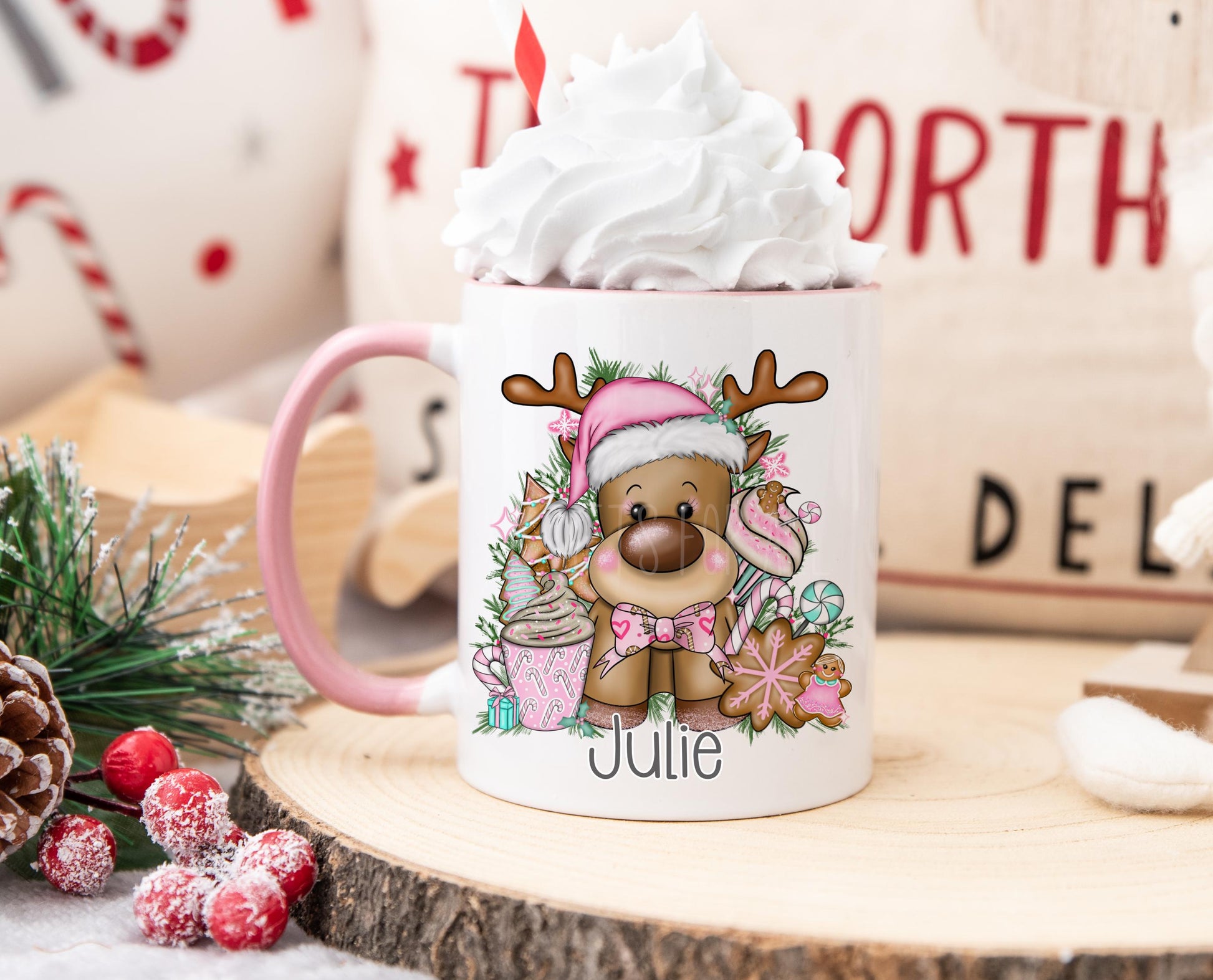 Cute brown reindeer with antlers and a pink christmas santa hat. Name in choice of pink or grey. A lovely mug for family movie nights. Personalisation will be printed as its typed, so please check spelling and punctuation is correct.