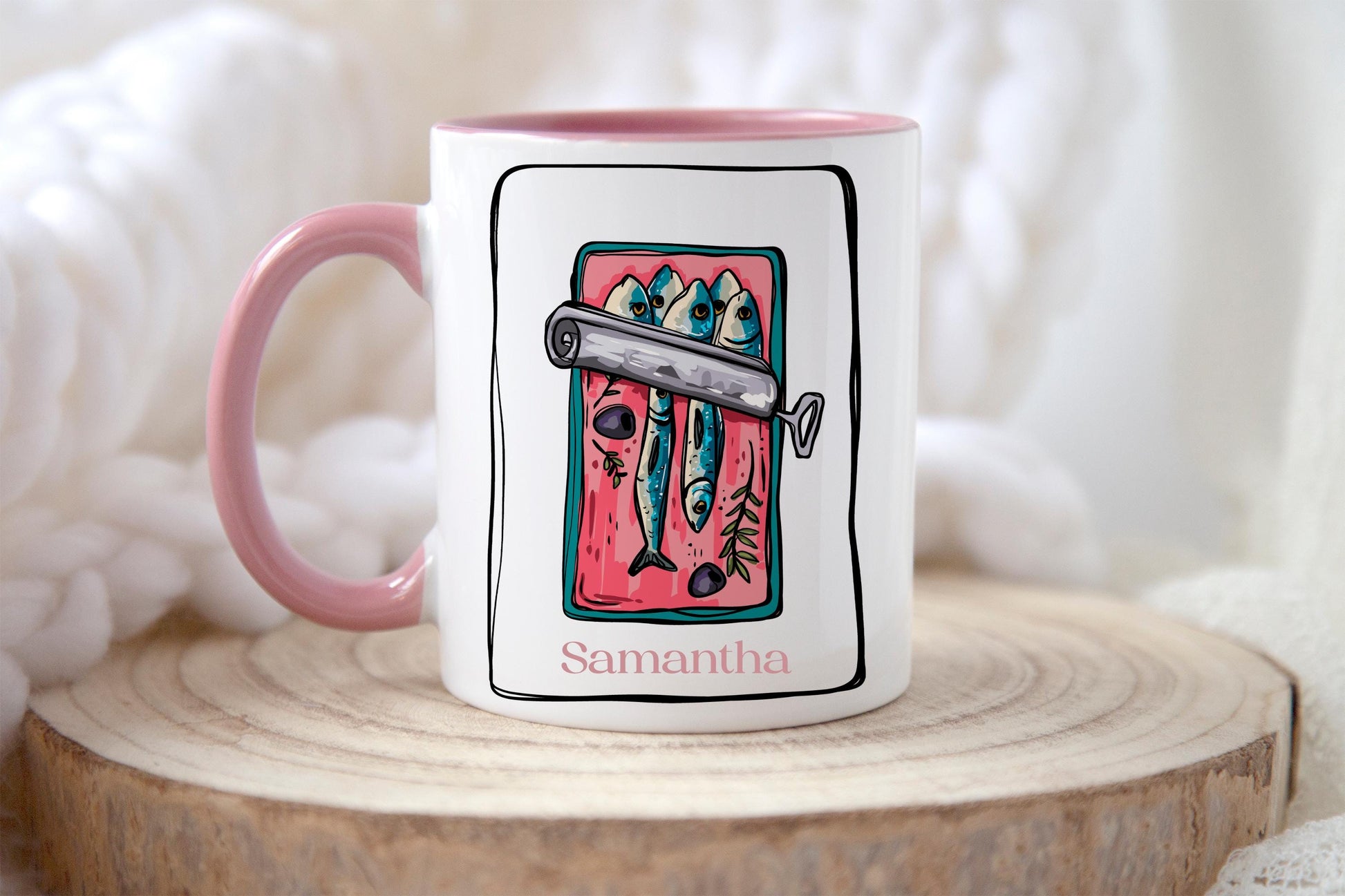 Sardines in a tin on a white ceramic mug with pink inner and handle. A lovely gift for anyone who loves sardines. Perfect birthday gift for wife, girlfriend, mum, nan, sister etc. Can be personalised with a name in pink. Tinned Fish lover mug and coaster. A trendy mug for any female.