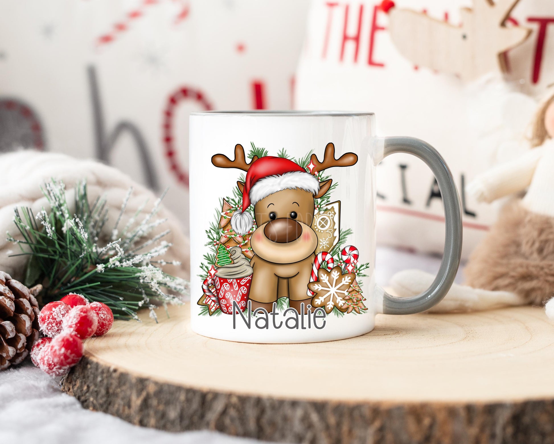 Personalised Reindeer Hot Chocolate Mug, Christmas Cocoa Mug, Xmas Movie Mug, Red Reindeer Christmas Mug