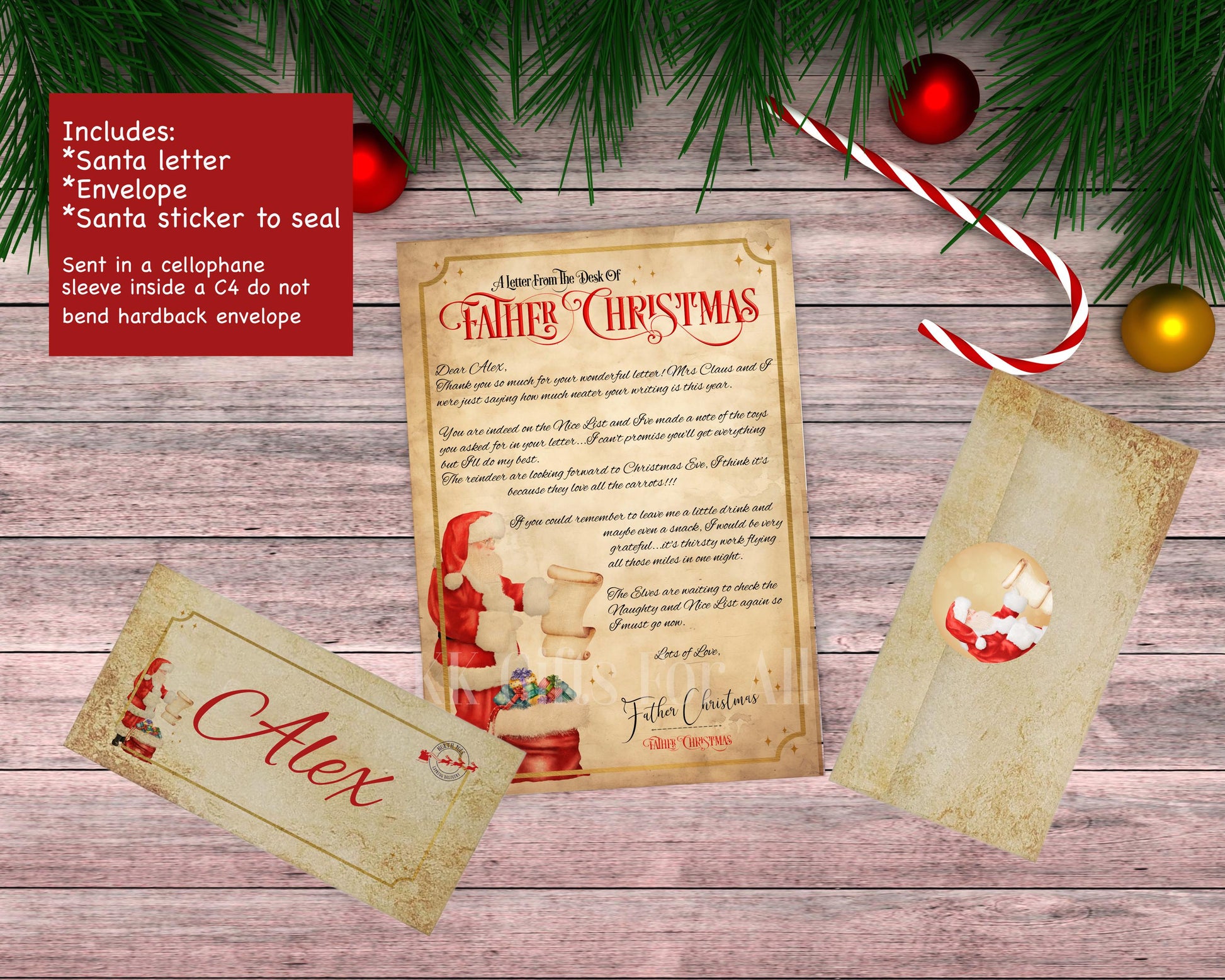 Vintage style paper Santa letter, with option of Nice list certificate. Each letter comes with an envelope with name and stamp printed on, and a sticker for you to attach after checking the letter. Certificate comes with a small cut of red ribbon, giving you the option to roll and tie with ribbon and place on tree or mantelpiece.