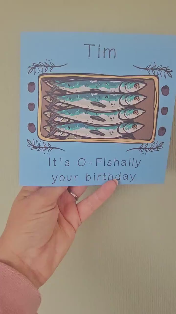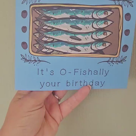 It's O-Fishally your birthday card. Blue saedine birthday card. Can be personalised at the top of card. Text in black. Sardines in a tin. Tinned Fish birthday card.