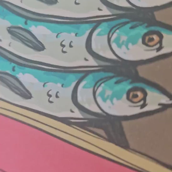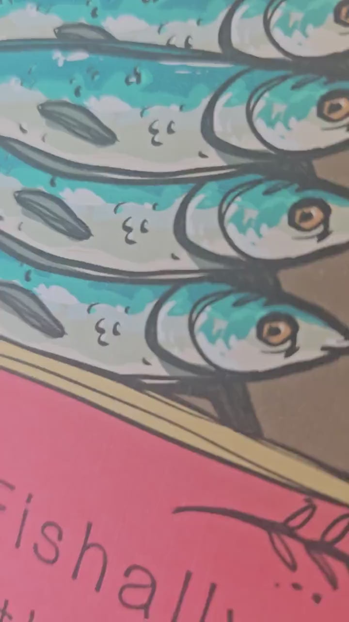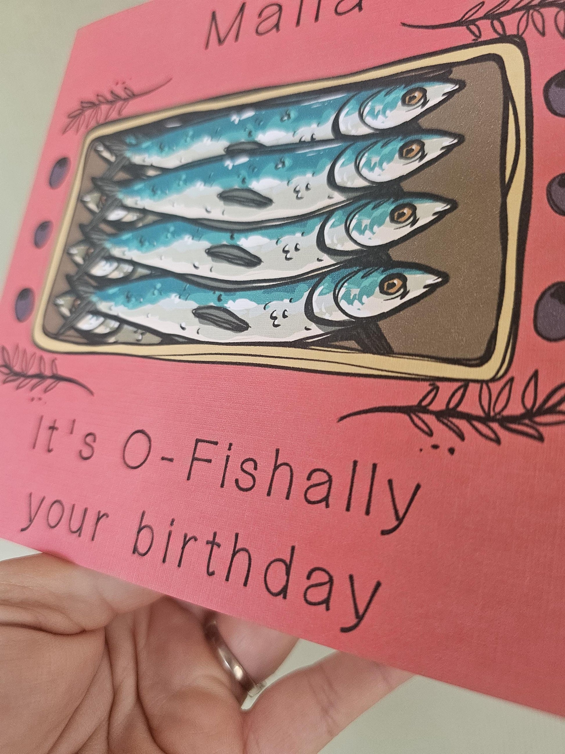 It's O-Fishally your birthday card. Pink sardine birthday card. Can be personalised at the top of card. Text in black. Sardines in a tin. Tinned Fish birthday card.