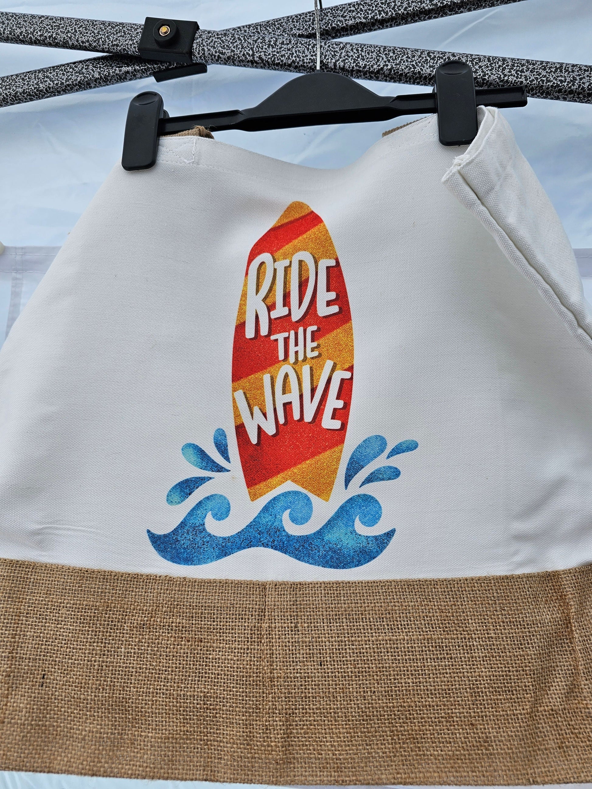 Ride The Waves Jute Tote Shopper Picnic Beach Bag, Eco Friendly Jute