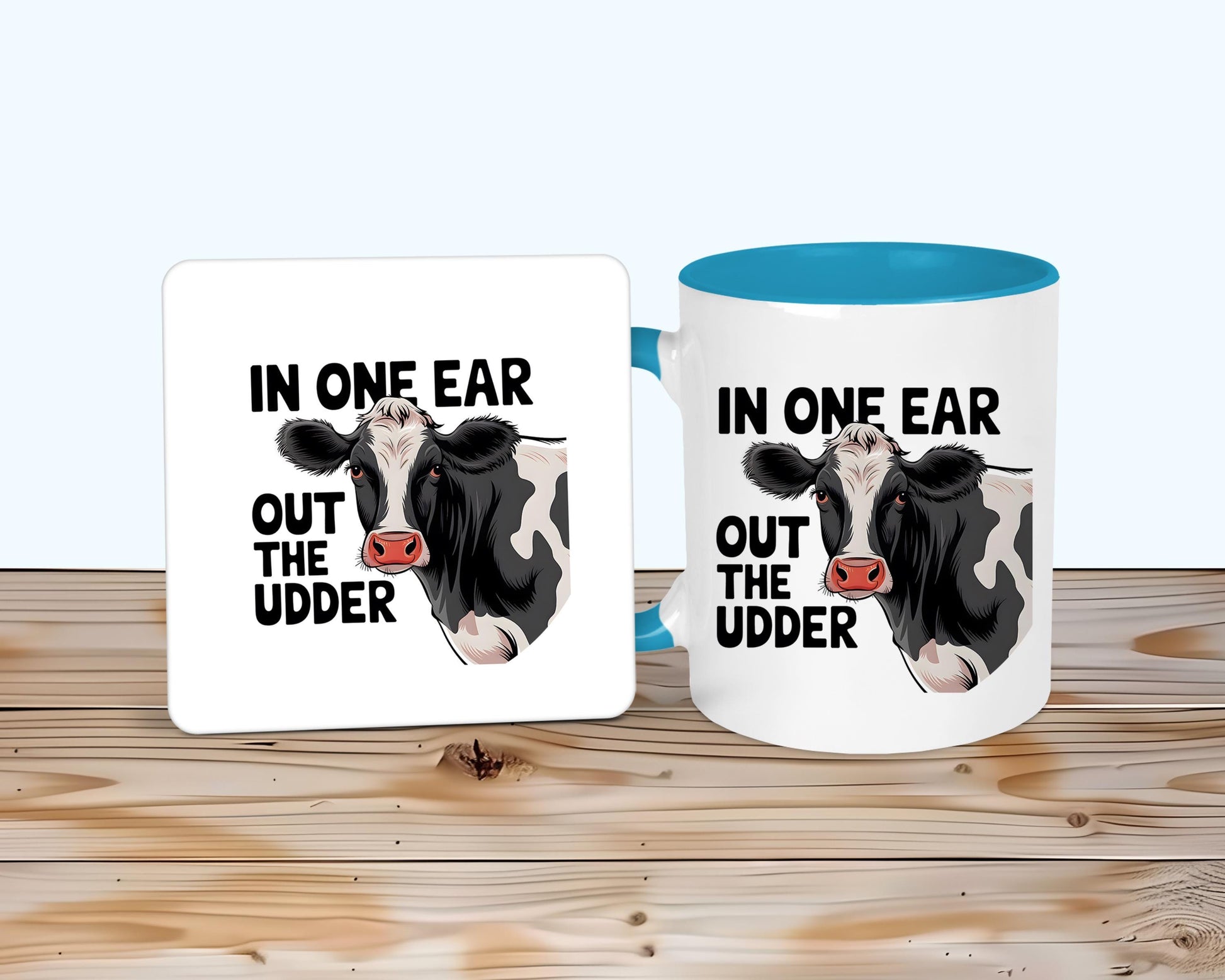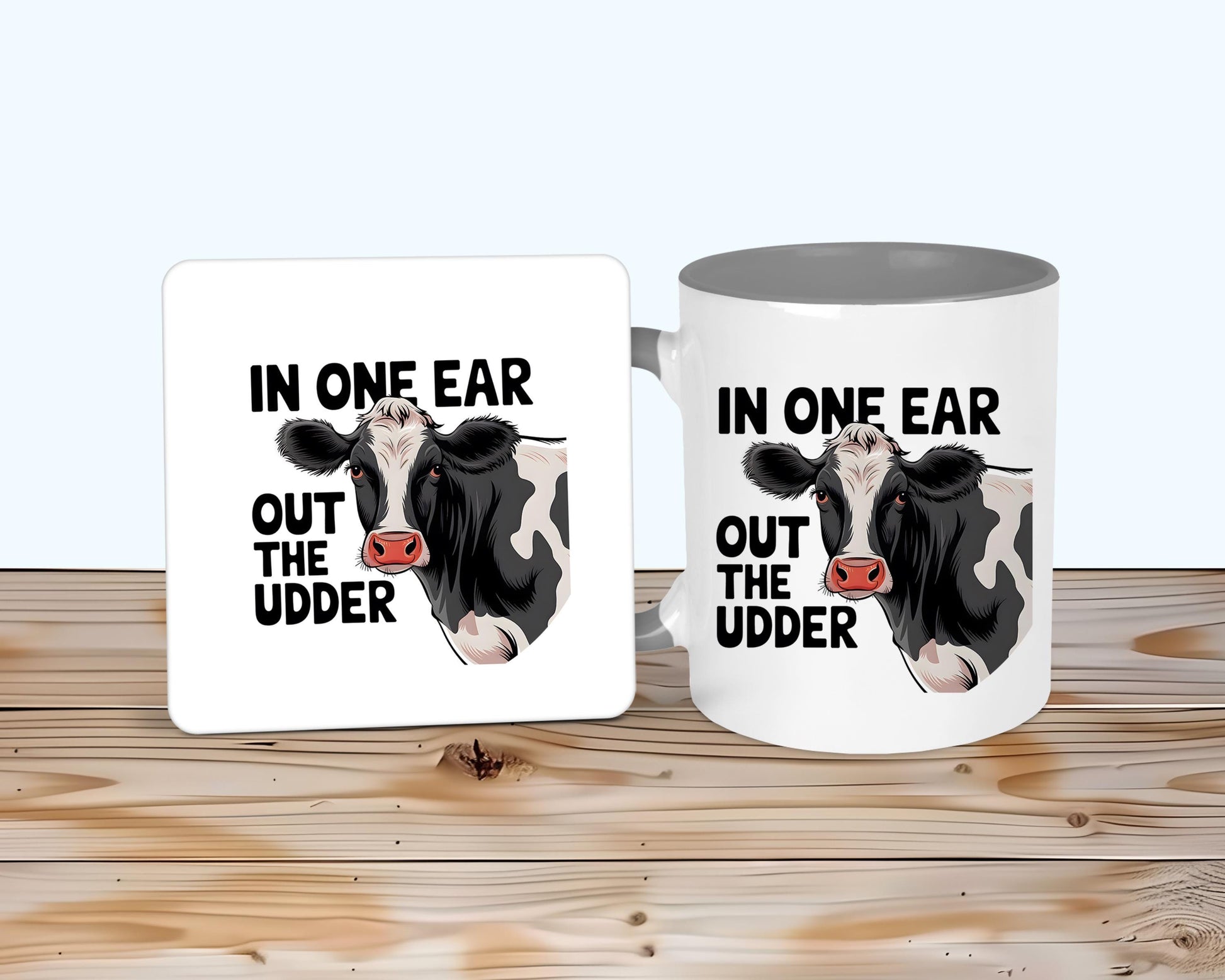 Black and white cow design on a ceramic mug and/or MDF coaster. Gift for mum, dad, grandparents, cattle farmer, or even someone who is always called on to help with the cows. A white mug with option of handle and inner colour. Text reads 'In one ear out the udder' in black text.