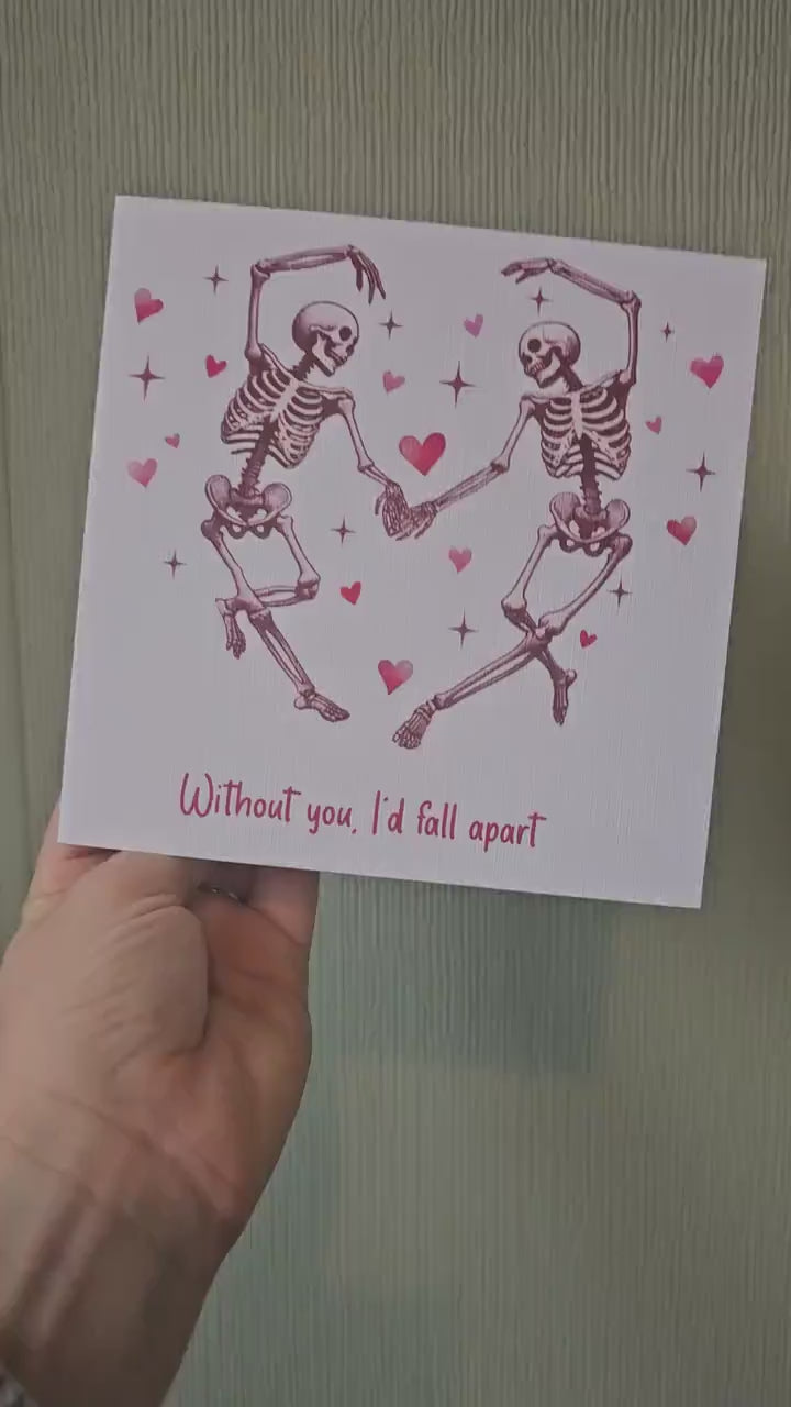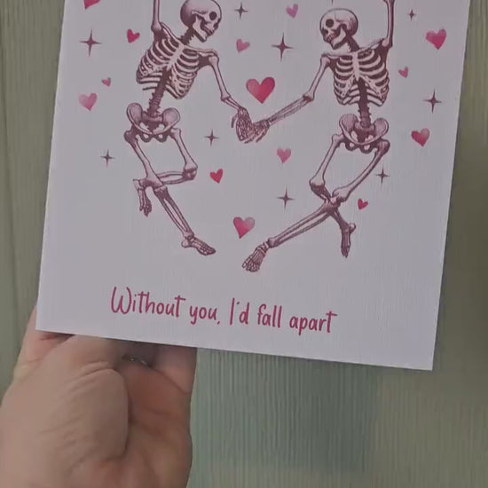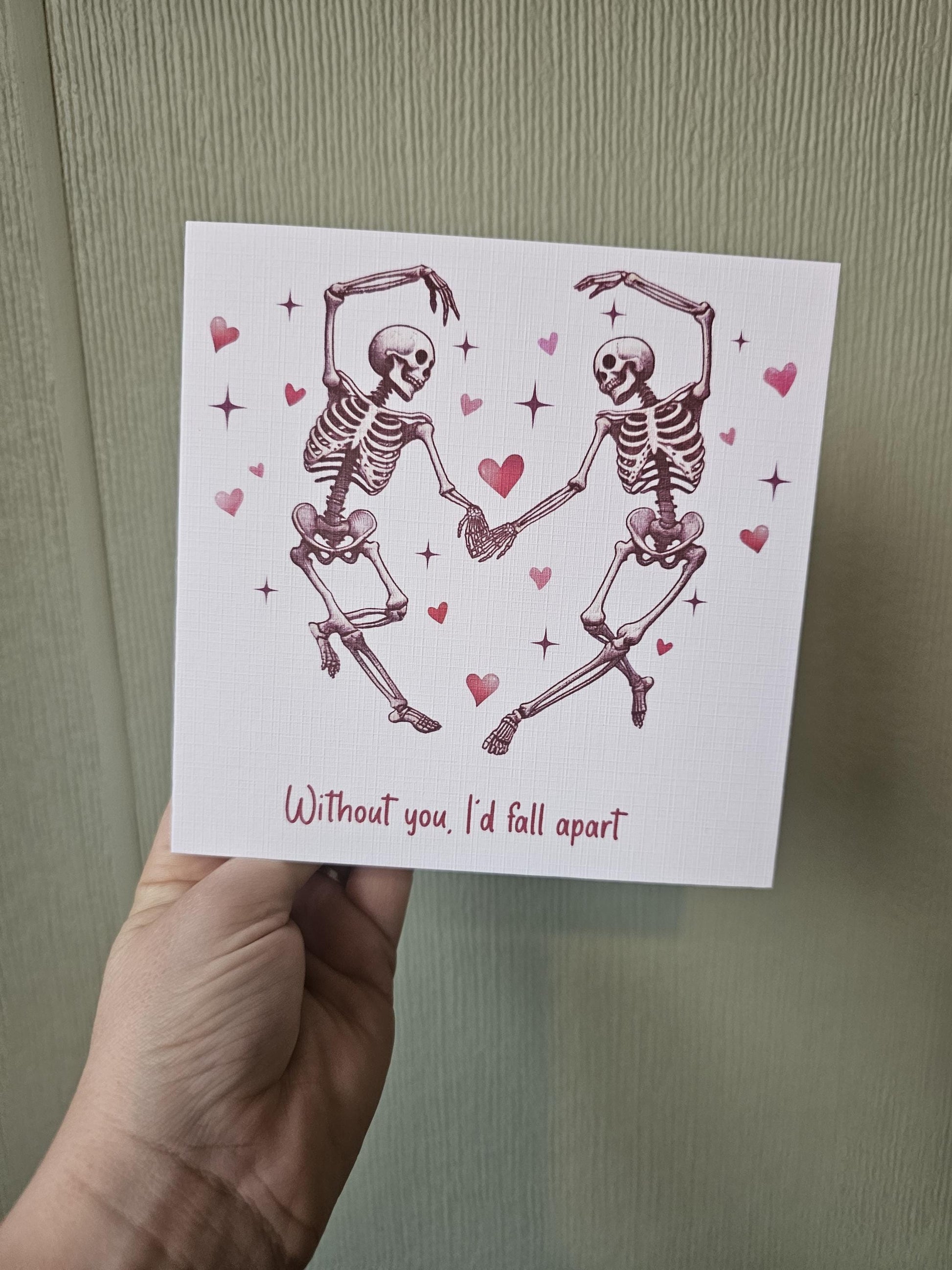 Funny Sarcastic Cute Valentines day card for wife, girlfriend, husband or boyfriend. Card to show your loved one how much they mean to you. Without you I'd fall apart. Skeleton couple card.